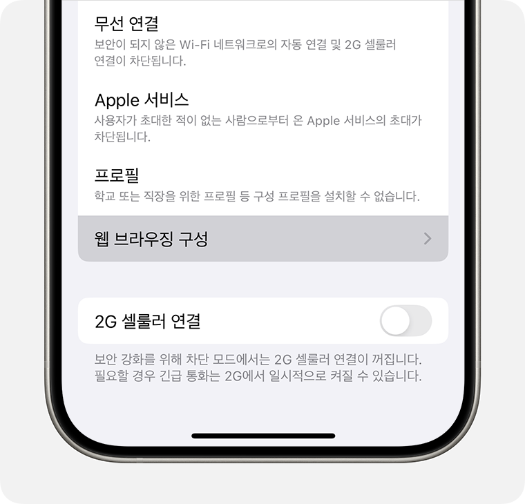 - 아이폰은 ‘잠금 모드’로 2G 차단 — iOS의 잠금 모드 안내에 따르면 아이폰에서 잠금 모드를 켜면 2G 셀룰러 지원이 꺼집니다(상시보다는 고위험 상황에서 권장).